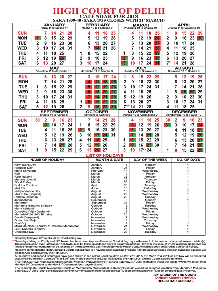 Delhi High Court Calendar 2018 Public Holiday Festival - Important links to consider for bombay high court recruitment 2021